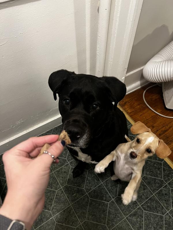 Both of our large breed dogs loved these treats. This may be our new go to for their treats. I've never seen them sit by the counter looking up at the treat jar