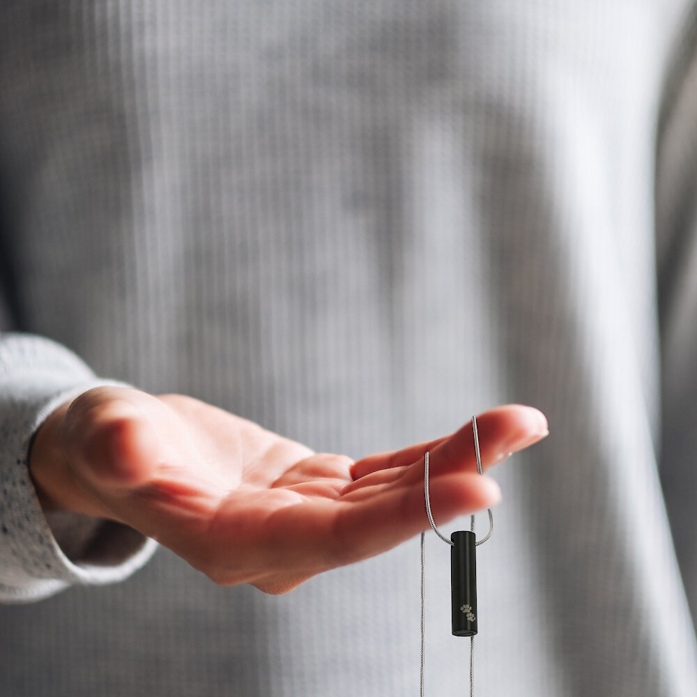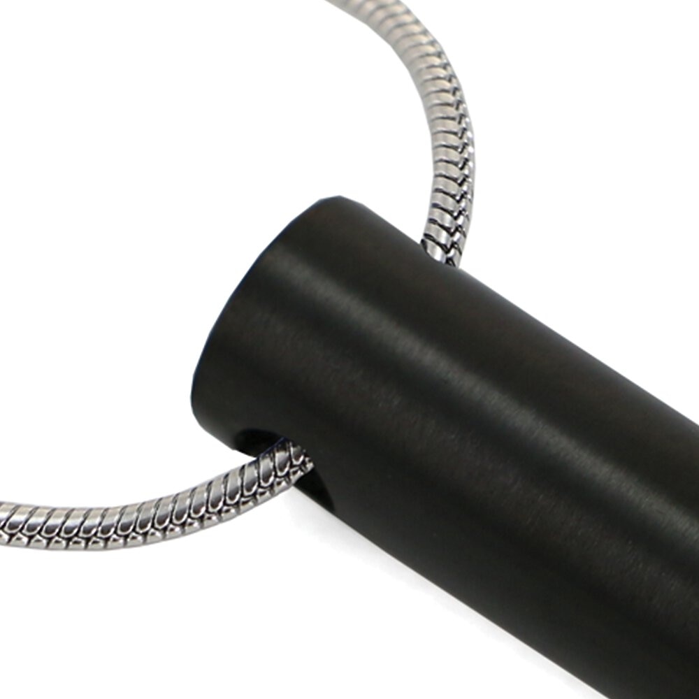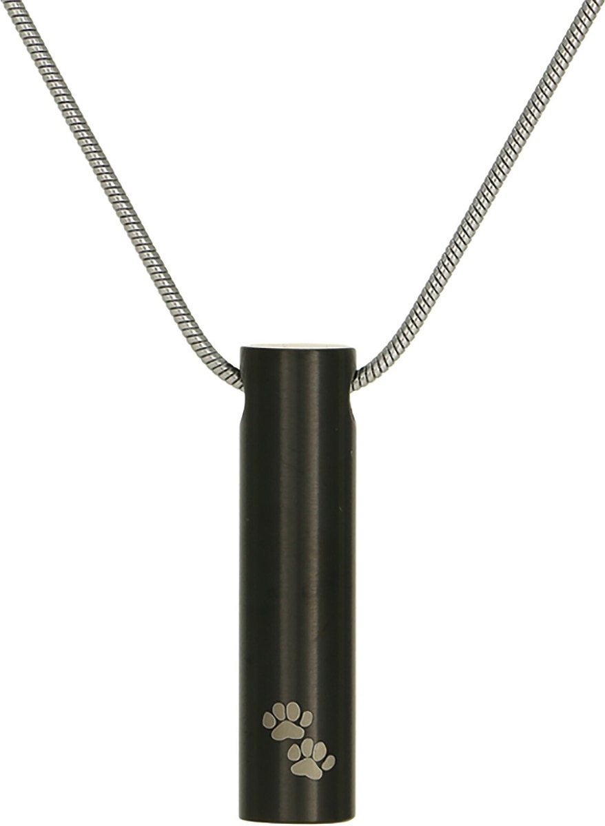 This necklace holds a small amount of cremated remains in the cylinder. It includes a filling kit and box for convenience.