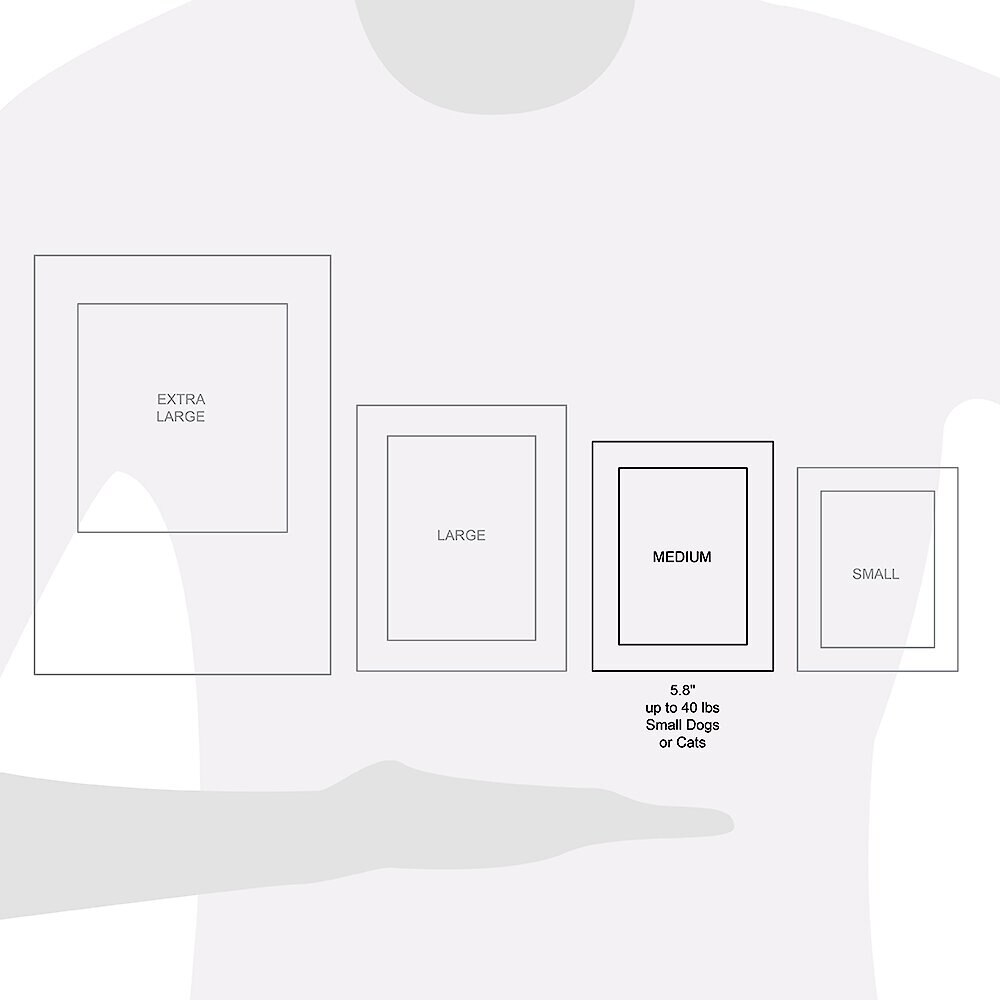 The Small is designed for dogs up to 20 pounds, the Medium is designed for dogs up to 40 pounds, the Large is designed for dogs up to 80 pounds, and the X-Large is designed for dogs up to 195 pounds.