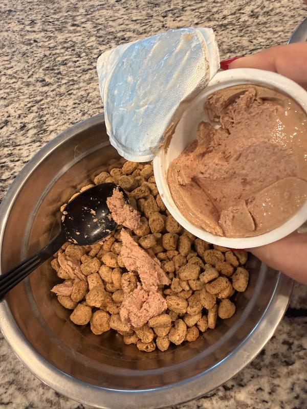 Our Bichon and our Mini Poodle eat Royal Canin kibble routinely. To it, I have been adding a tablespoon of RV pate for their skin and coat. So, I just substituted