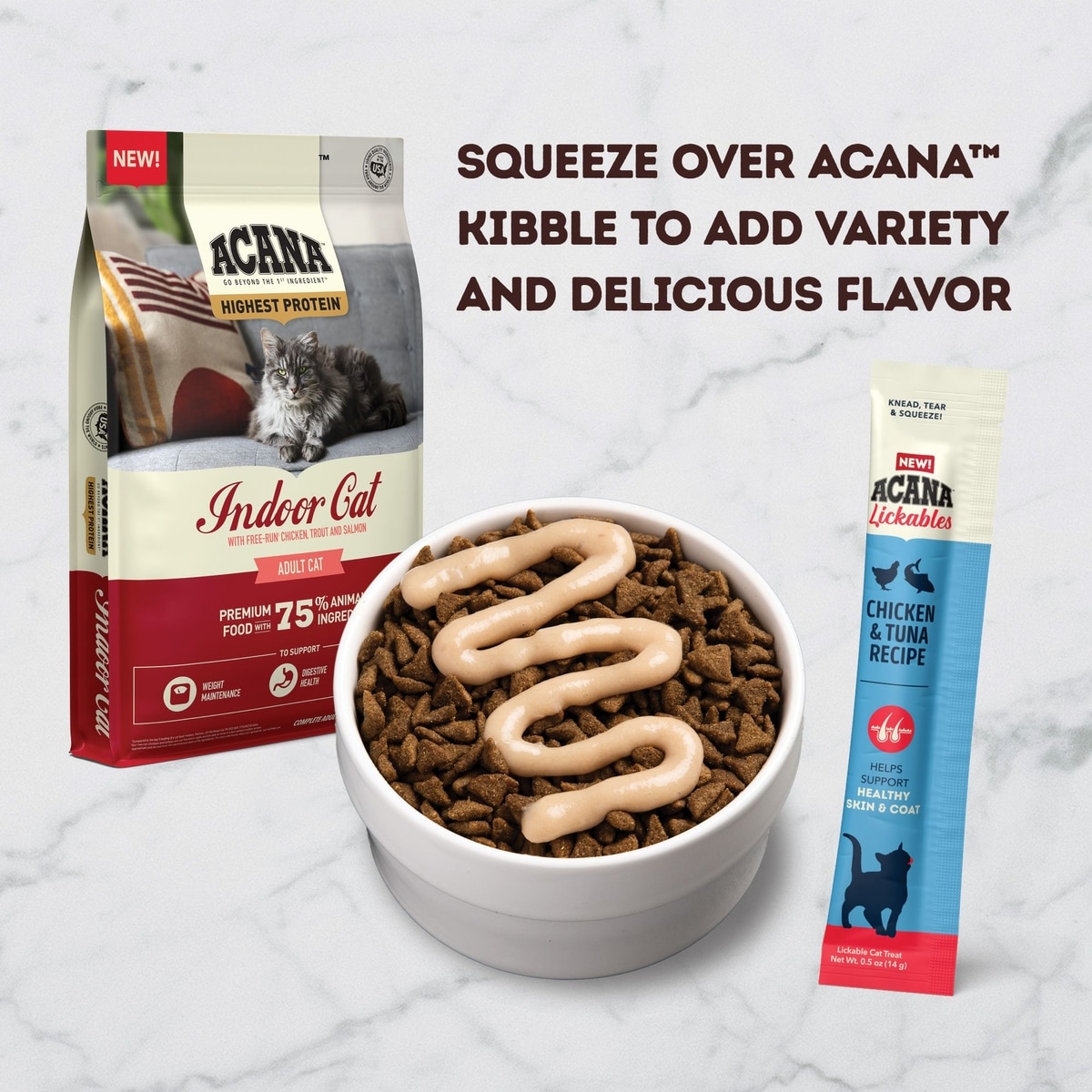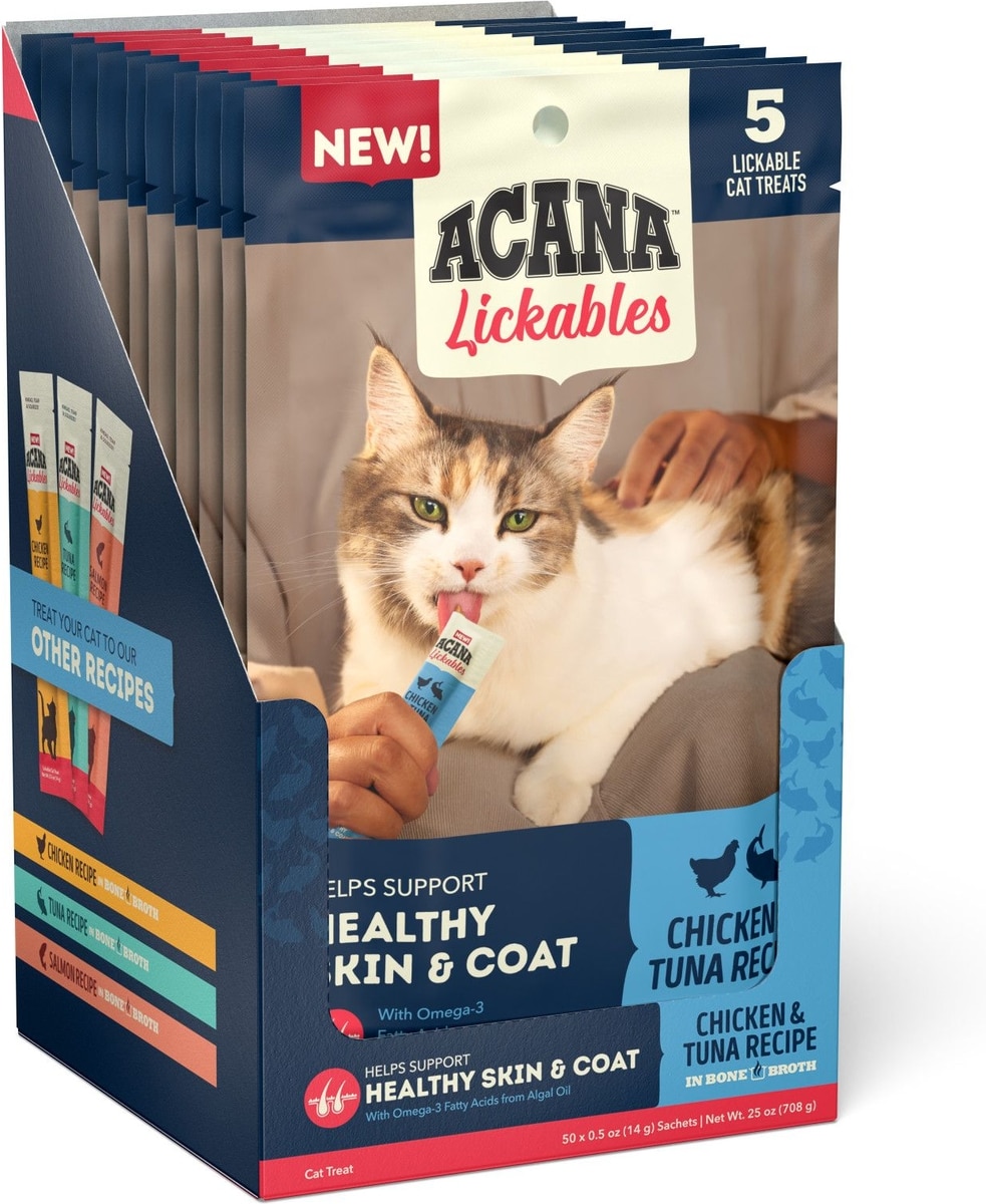 - ACANA Tuna Lickables Cat Treats, 2.5-oz pouch, 5 count$4.99 Chewy Price$4.74 Autoship PricePromo, New Customers Only: Spend $49+, Get $20 eGift Card +1 deal