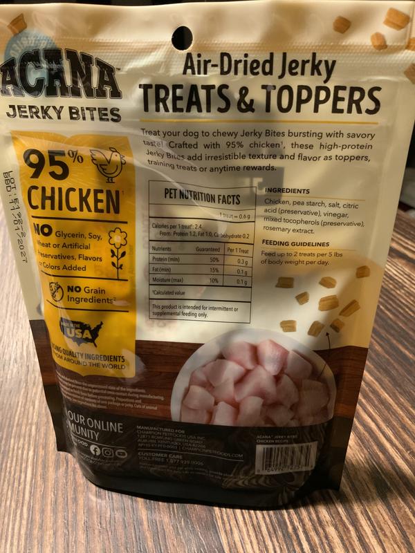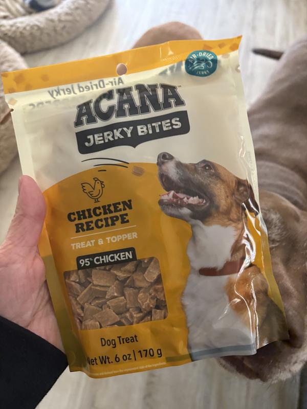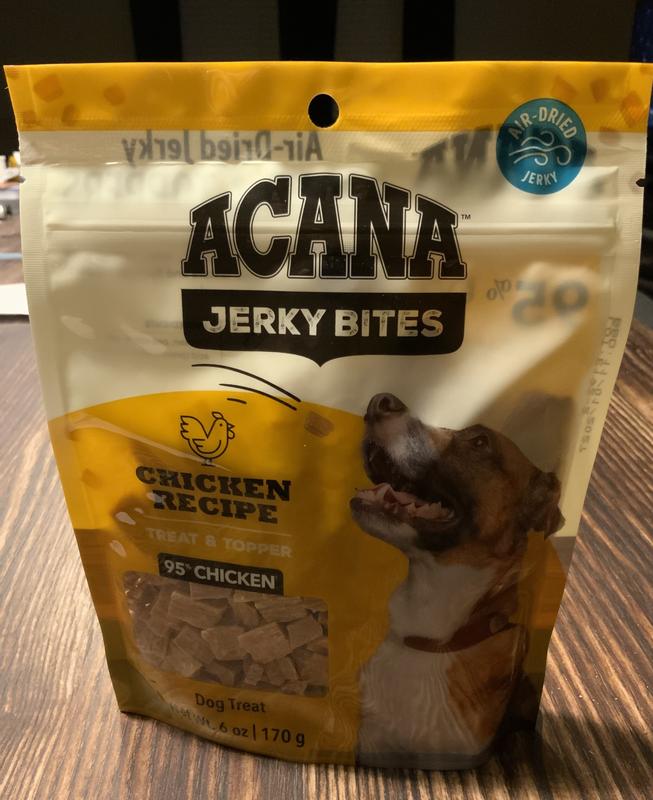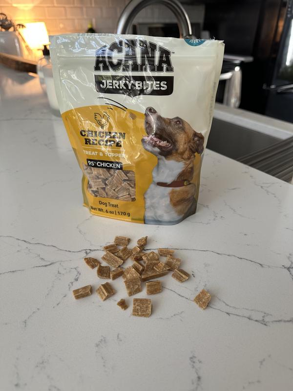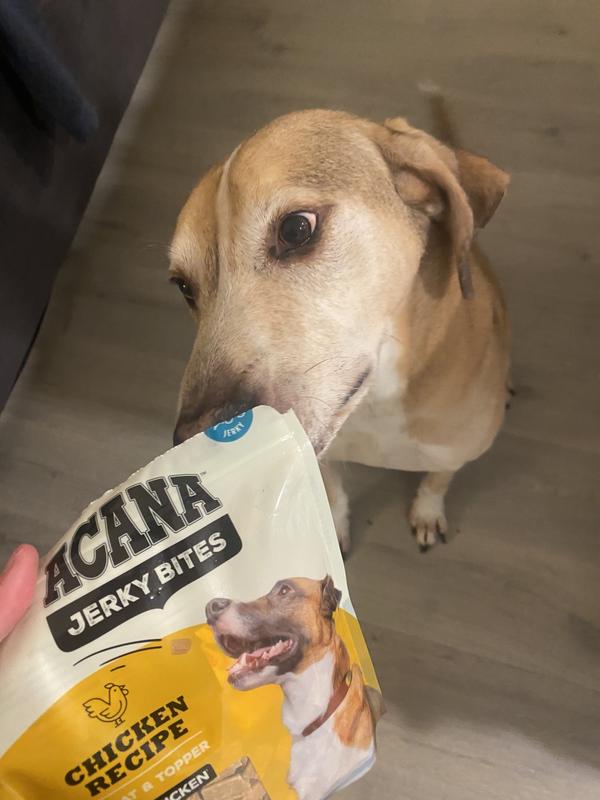 ACANA Jerky Bites give dogs irresistible texture and flavor for a deliciously savory treat! The air-dried jerky is high in animal protein and a nourishing choice for toppers, training treats or anytime rewards.