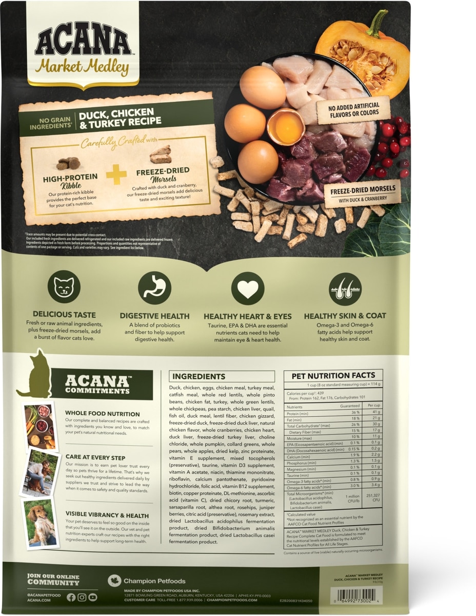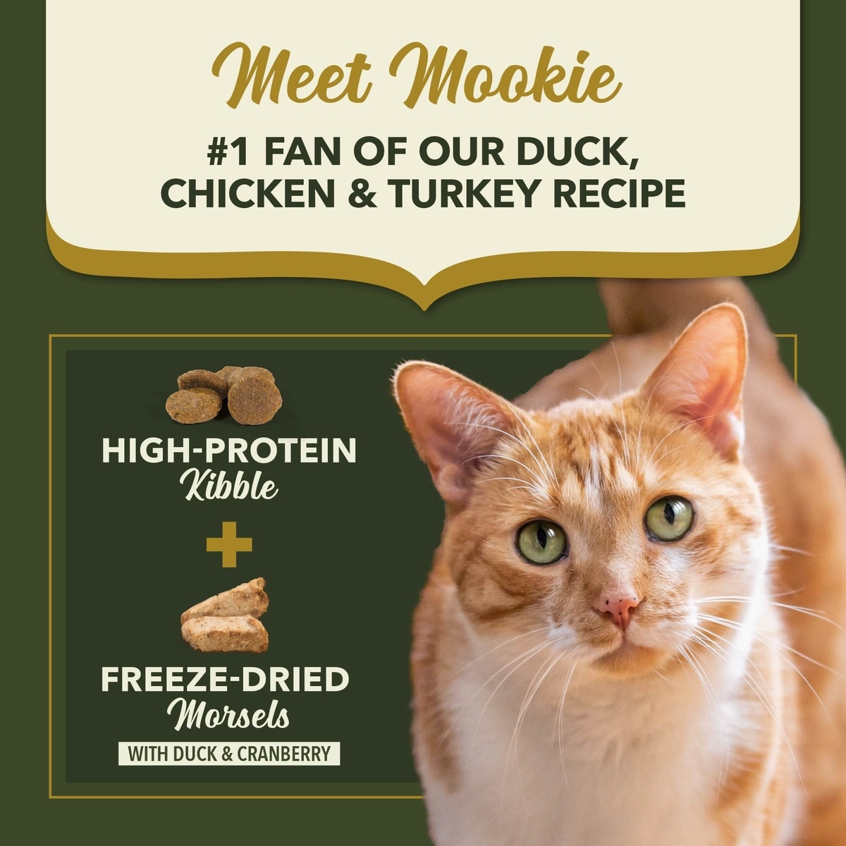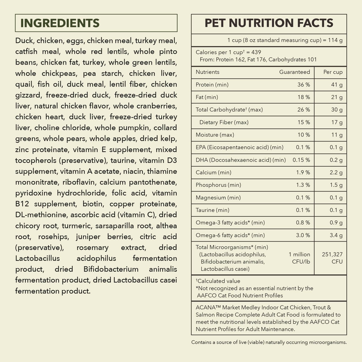 Duck, Chicken, Eggs, Chicken Meal, Turkey Meal, Catfish Meal, Whole Red Lentils, Whole Pinto Beans, Chicken Fat, Turkey, Whole Green Lentils, Whole Chickpeas, Pea Starch, Chicken Liver, Quail, Fish Oil, Duck Meal, Lentil Fiber, Chicken Gizzard, Freeze-Dried Duck, Freeze-Dried Duck Liver, Natural Chicken Flavor, Whole Cranberries, Chicken Heart, Duck Liver, Freeze-Dried Turkey Liver, Choline Chloride, Whole Pumpkin, Collard Greens, Whole Pears, Whole Apples, Dried Kelp, Zinc Proteinate, Vitamin E Supplement, Mixed Tocopherols (Preservative), Taurine, Vitamin D3 Supplement, Vitamin A Acetate, Niacin, Thiamine Mononitrate, Riboflavin, Calcium Pantothenate, Pyridoxine Hydrochloride, Folic Acid, Vitamin B12 Supplement, Biotin, Copper Proteinate, DL-Methionine, Ascorbic Acid (Vitamin C), Dried Chicory Root, Turmeric, Sarsaparilla Root, Althea Root, Rosehips, Juniper Berries, Citric Acid (Preservative), Rosemary Extract, Dried Lactobacillus Acidophilus Fermentation Product, Dried Bifidobacterium Animalis Fermentation Product, Dried Lactobacillus Casei Fermentation Product.