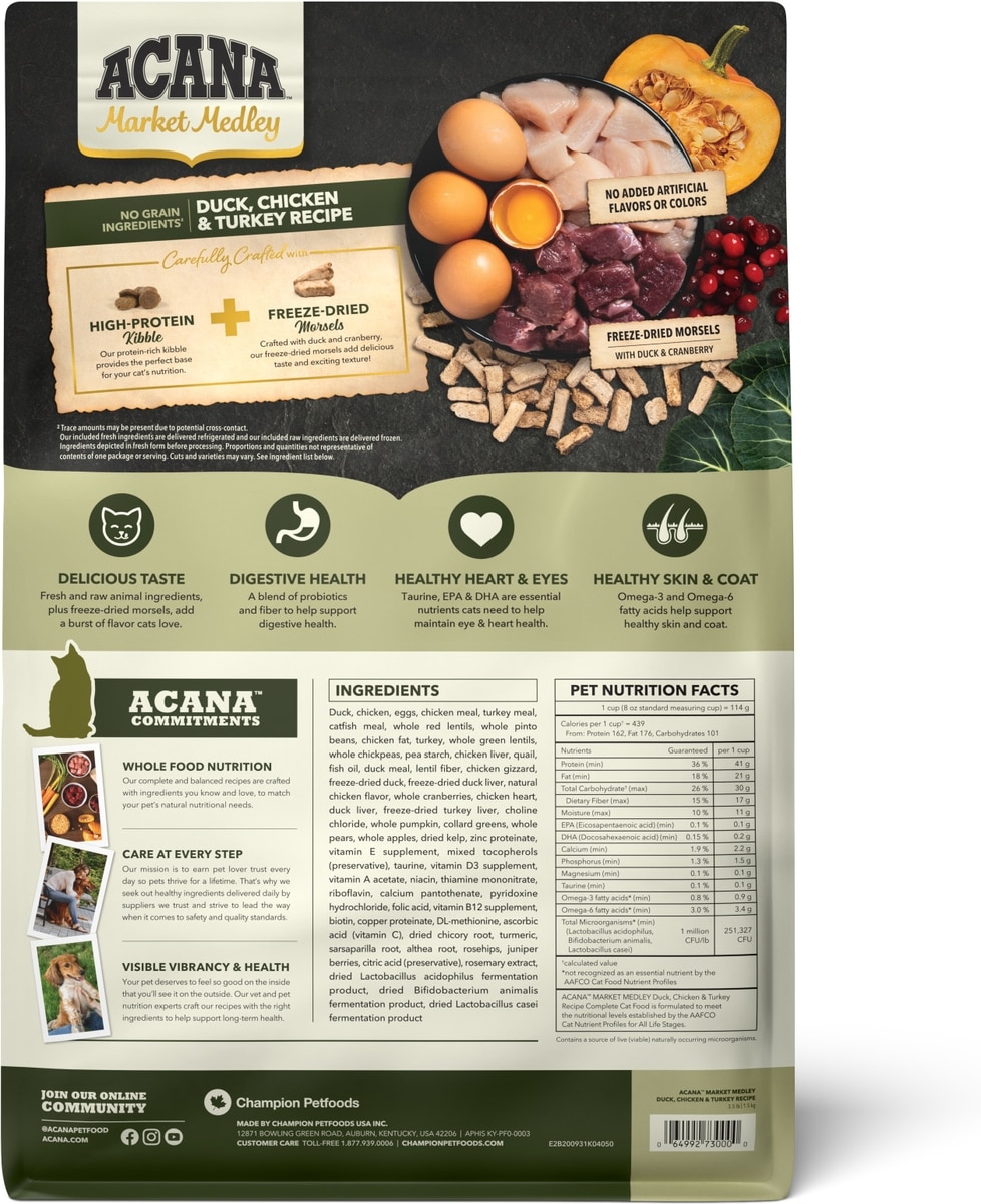 Duck, Chicken, Eggs, Chicken Meal, Turkey Meal, Catfish Meal, Whole Red Lentils, Whole Pinto Beans, Chicken Fat, Turkey, Whole Green Lentils, Whole Chickpeas, Pea Starch, Chicken Liver, Quail, Fish Oil, Duck Meal, Lentil Fiber, Chicken Gizzard, Freeze-Dried Duck, Freeze-Dried Duck Liver, Natural Chicken Flavor, Whole Cranberries, Chicken Heart, Duck Liver, Freeze-Dried Turkey Liver, Choline Chloride, Whole Pumpkin, Collard Greens, Whole Pears, Whole Apples, Dried Kelp, Zinc Proteinate, Vitamin E Supplement, Mixed Tocopherols (Preservative), Taurine, Vitamin D3 Supplement, Vitamin A Acetate, Niacin, Thiamine Mononitrate, Riboflavin, Calcium Pantothenate, Pyridoxine Hydrochloride, Folic Acid, Vitamin B12 Supplement, Biotin, Copper Proteinate, DL-Methionine, Ascorbic Acid (Vitamin C), Dried Chicory Root, Turmeric, Sarsaparilla Root, Althea Root, Rosehips, Juniper Berries, Citric Acid (Preservative), Rosemary Extract, Dried Lactobacillus Acidophilus Fermentation Product, Dried Bifidobacterium Animalis Fermentation Product, Dried Lactobacillus Casei Fermentation Product.