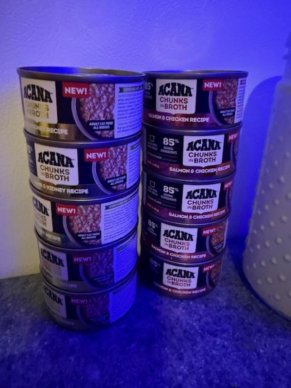 - DealACANA Salmon & Chicken + Chicken & Tuna Variety Pack Chunks in Broth Wet Cat Food, 3-oz can, case of 12$24.99 Chewy Price$23.74 Autoship PricePromo, Spend $100, Get $30 eGift Card with code NEWYEAR +2 deals