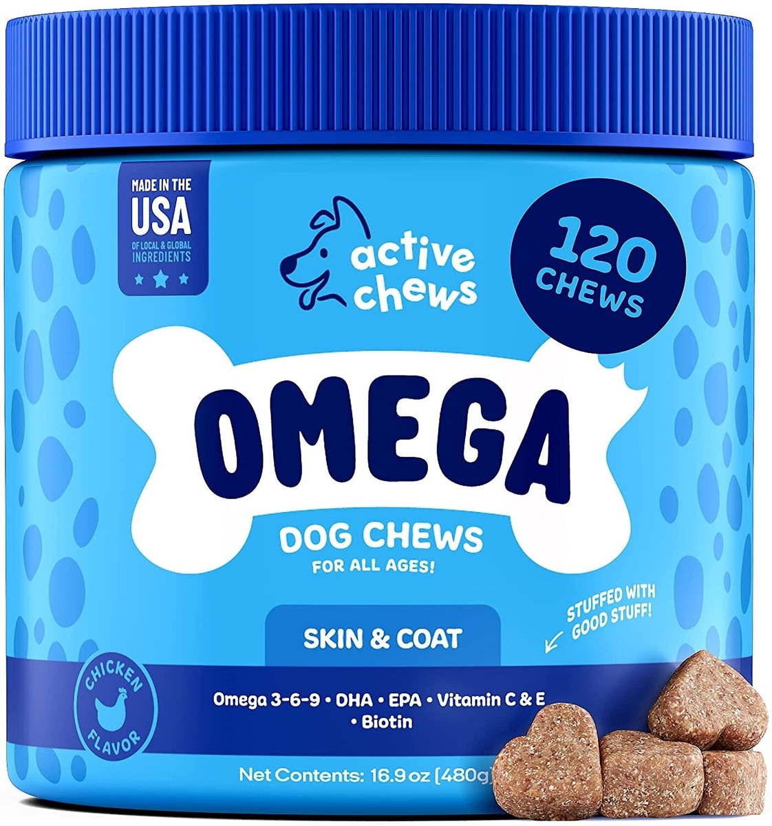 My dog loves the active chews premium omega skin and coat pure fish oil dog supplement.