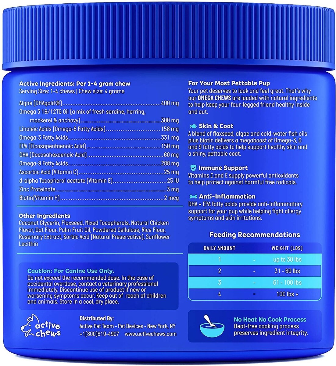 Active Ingredients (per 4g Chew): Algae (DHAgold), Omega-3 18/12TG Oil, Linoleic Acid (Omega-6 Fatty Acids), Omega-3 Fatty Acids, EPA (Eicosapentaenoic Acid), DHA (Docosahexaenoic Acid), Omega-9 Fatty Acids, Ascorbic Acid (Vitamin C), d-alpha Tocopherol acetate (Vitamin E), Zinc Proteinate, Biotin (Vitamin H).