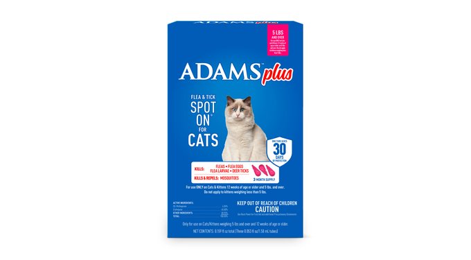 ADAMS Plus Flea & Tick Spot On for Cats is made for felines 5 pounds and over. Each easy-to-use applicator is designed for mess-free application and parts the coat for direct, on-skin coverage. The no-drip formula won’t make a mess on your cat’s fur. Each box provides a 3-month supply to help keep your cat protected all season long.