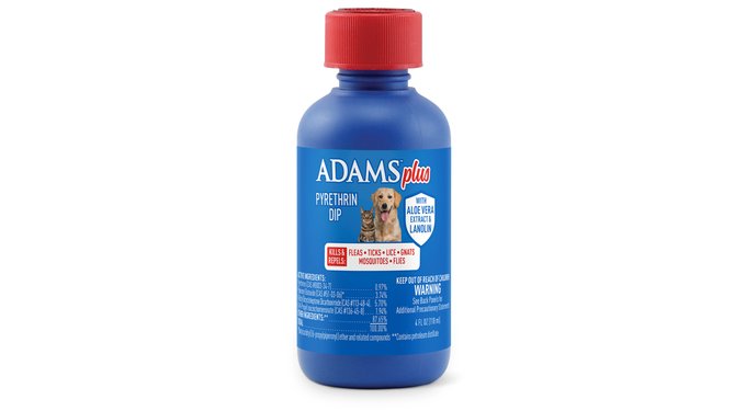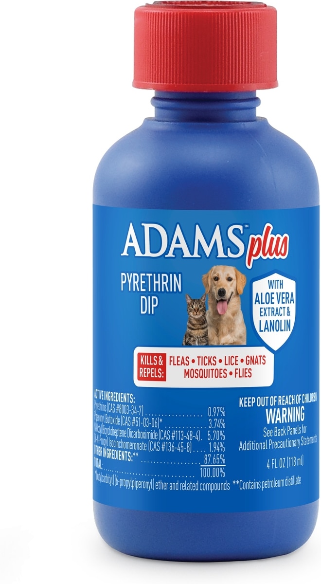 Fleas and ticks are more than just a nuisance, they can cause skin irritation, allergy issues and even transmit disease. Give your pet relief from fleas and ticks with the easy-to-use ADAMS Plus Pyrethrin Dip. Formulated with an effective combination of active ingredients, this flea and tick treatment for dogs and cats kills and repels fleas, ticks, lice, gnats, mosquitoes and flies. Just one quick soak in ADAMS Plus Pyrethrin Dip is enough to protect your pet against labeled pests.
