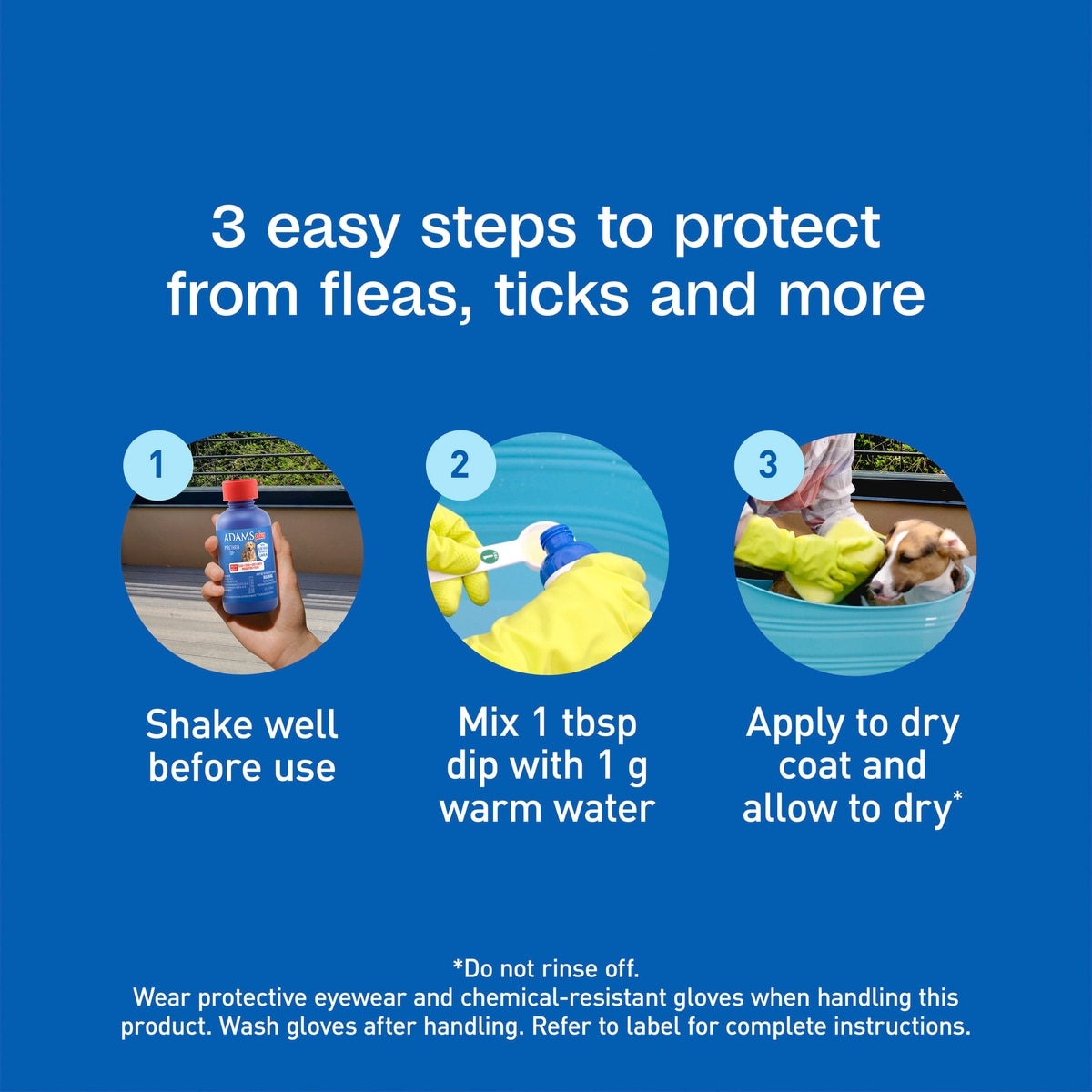 ADAMS Plus Pyrethrin Dip is easy to use and helps eliminate labeled pests on your pet. Shake the bottle well before each use. Add 1 tbsp of the dip solution to 1 gallon of warm water and sponge or dip your pet in the diluted formula. Let it dry for effective flea and tick protection on cats and dogs. Wear protective eyewear and chemical-resistant gloves when handling this product.