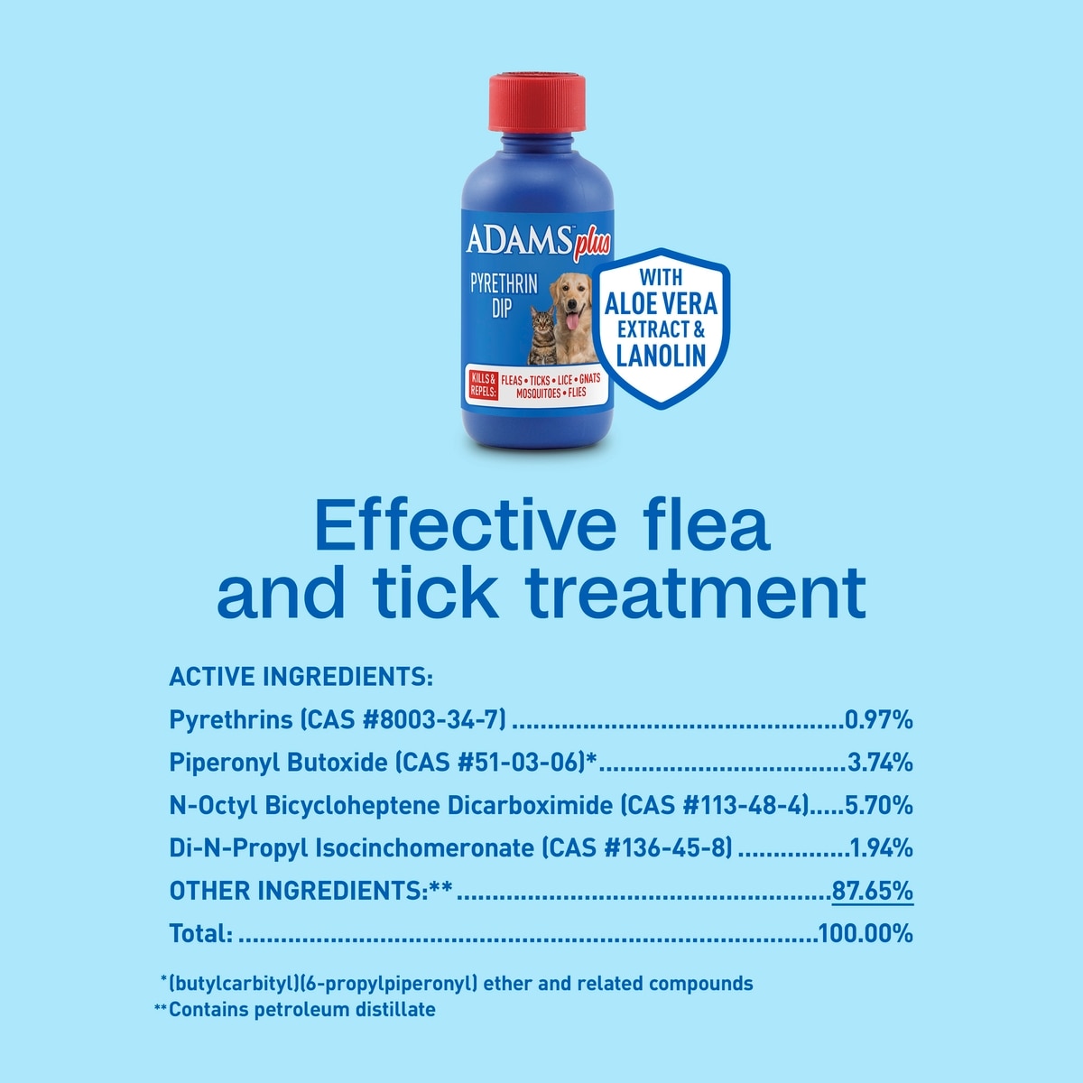 Say goodbye to fleas and ticks with a simple dip. The concentrated formula of ADAMS Plus Pyrethrin Dip is an easy and effective way to get rid of fleas, ticks and other labeled nuisance pests from your pet. Made with aloe vera extract and lanolin as part of a flea and tick formula for dogs and cats.