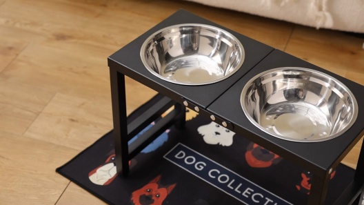 • For convenience, it’s easy to assemble and comes with 2 stainless steel bowls and a waterproof mat.