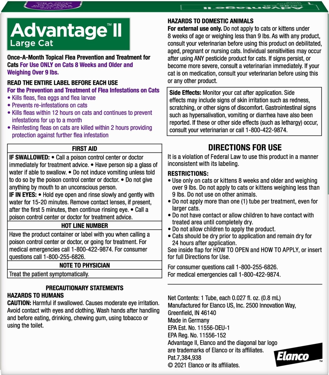Advantage II Flea Spot Treatment for Cats, over 9 lbs, 1 Dose (1-mo. supply)—Help protect your feline friend from parasitic pests and the potentially harmful diseases they can transmit with Advantage II Flea Treatment for Large Cats. This highly-effective, veterinarian-recommended treatment is specifically formulated to kill all life stages of fleas on contact with no painful biting required.