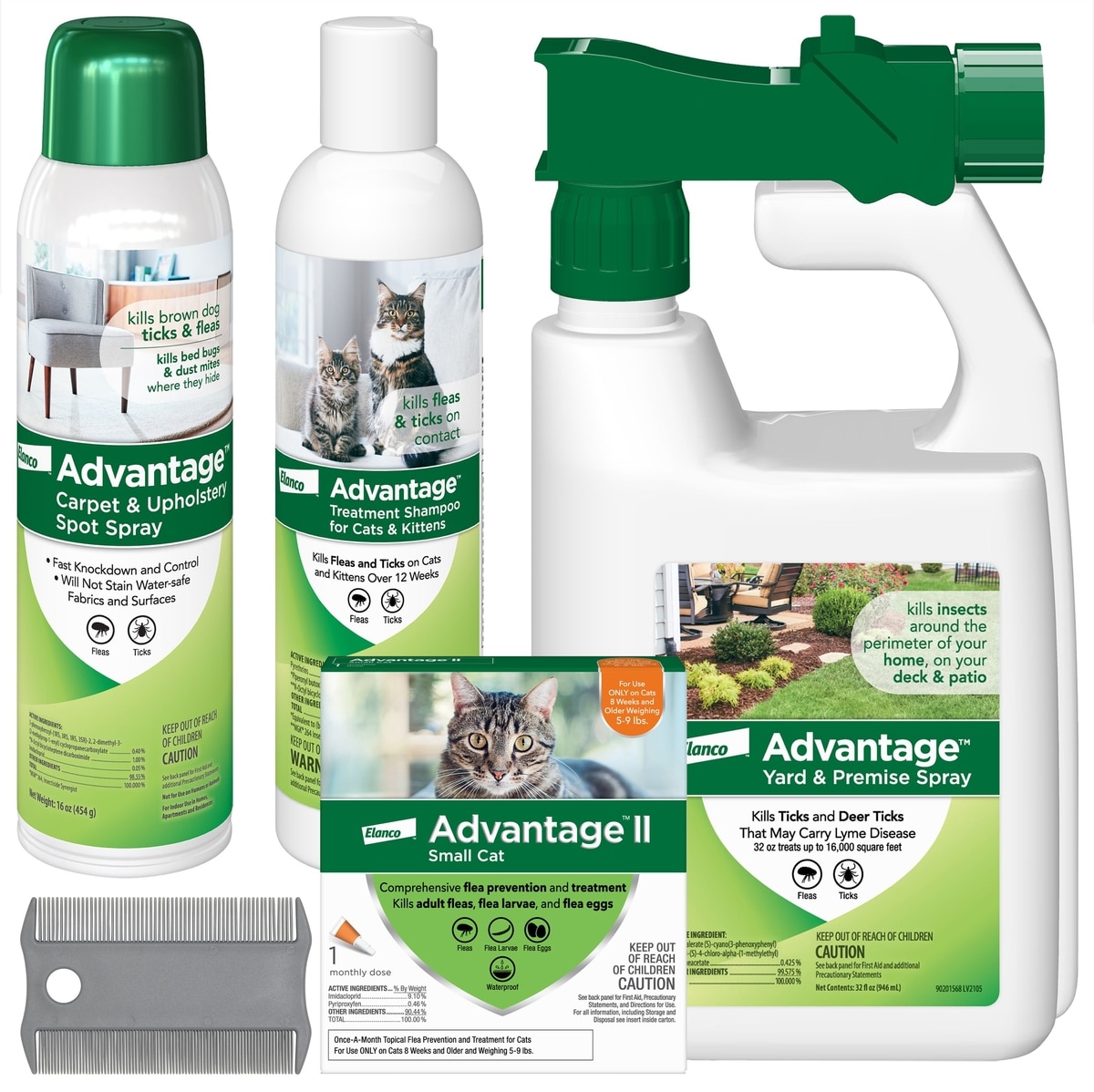 Bundle: Flea & Tick - Advantage II Spot Treatment, 5-9 lbs, Advantage Shampoo, Yard & Premise Spray, Carpet & Upholstry Spot Spray & Frisco Flea Comb