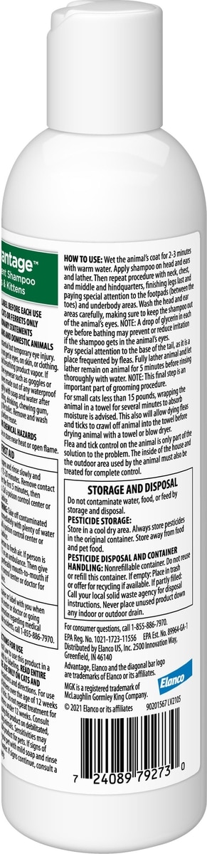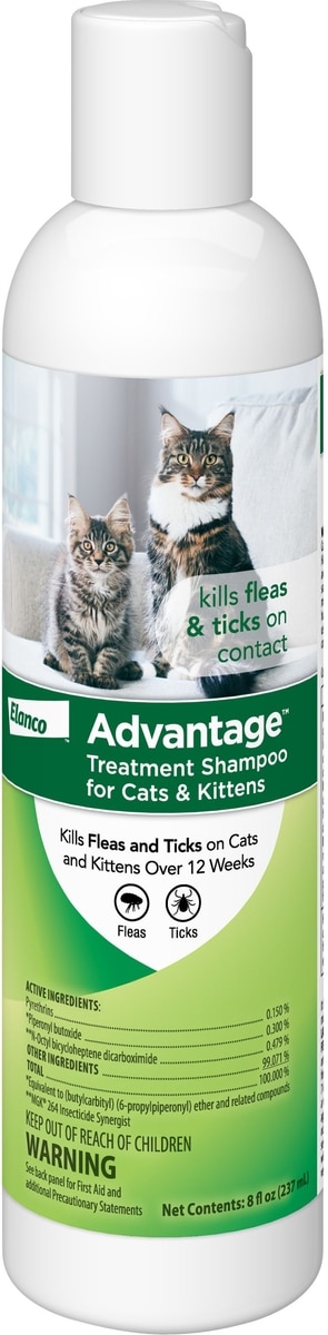 Advantage Flea & Tick Treatment Shampoo for Cats & Kittens, 8-oz bottle—Help protect your furry friend from parasitic pests and the potentially harmful diseases they can transmit with Advantage Flea & Tick Treatment Shampoo for Cats & Kittens. This scientifically-formulated, unscented shampoo contains a highly-effective combination of ingredients that work to kill fleas and ticks on contact.