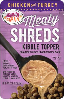 Against the Grain Shreds Slow Cooked Shredded Chicken & Turkey Kibble Topper Sensitive Digestion Pea Free Wet Dog Food Topper, 2.8-oz pouch, case of 24