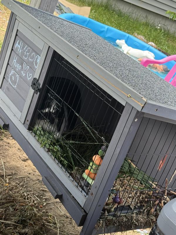 This hutch is used for our indoor 4lb holland lop. Whenever he pees, unless he’s sitting directly in the middle of the hutch, it runs down the wood and puddles into the floor. Clearly a design flaw for inside use. I’ve tried puppy pads to help absorb around the wood, the litter filler in the tray, nothing helps keep it from puddling. I have to mop his hutch area 2x a day as well as take it outside to pressure wash the legs due to iron soaking in and smelling