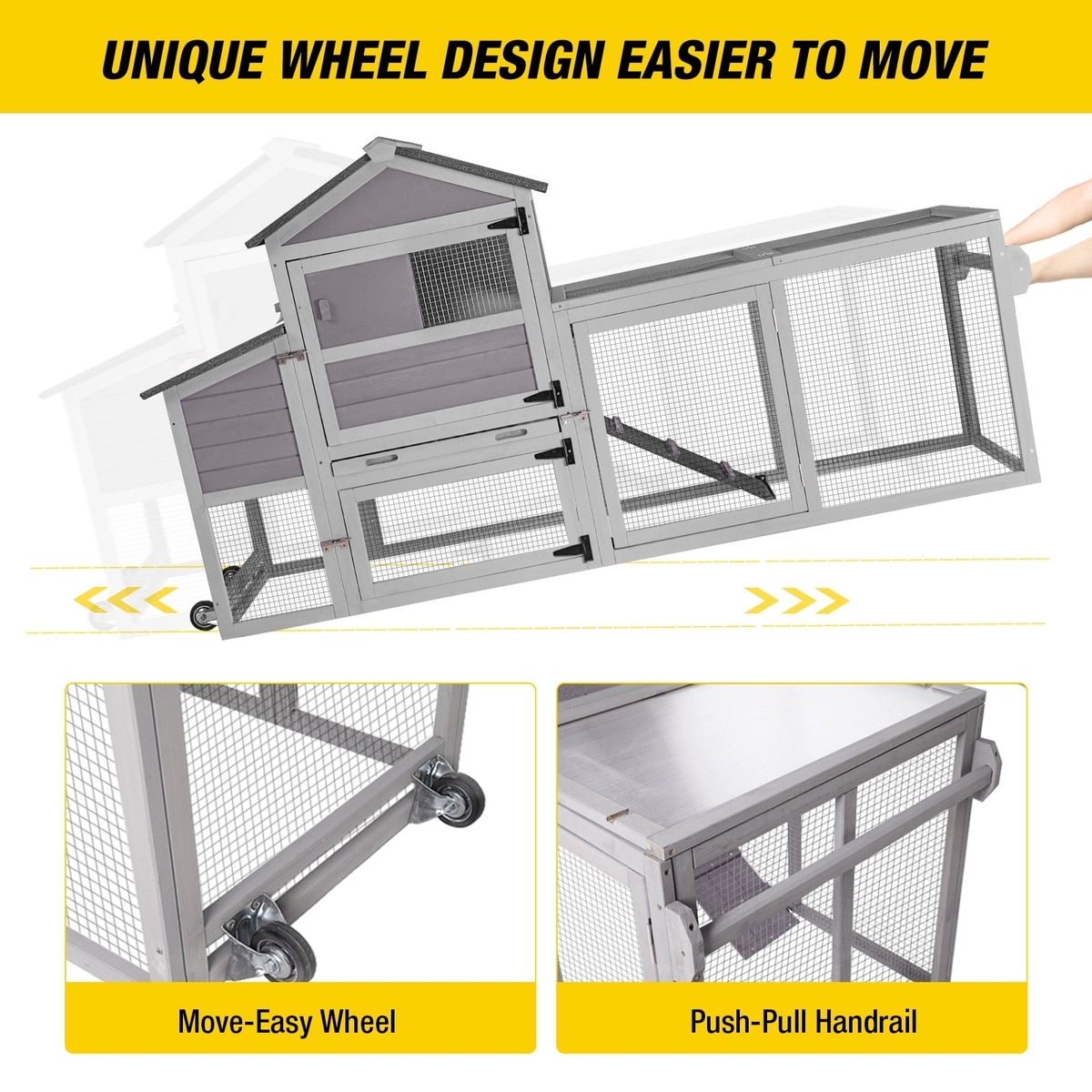 • With 2 sturdy metal wheels and a long handle, this poultry house can be easily moved to different locations, resulting in happier chickens and better-quality eggs.