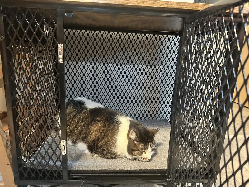 Looks great, better than those old metal crates. Love that it has two doors. Very easy to assemble. Love that it has a tray and pillow included.