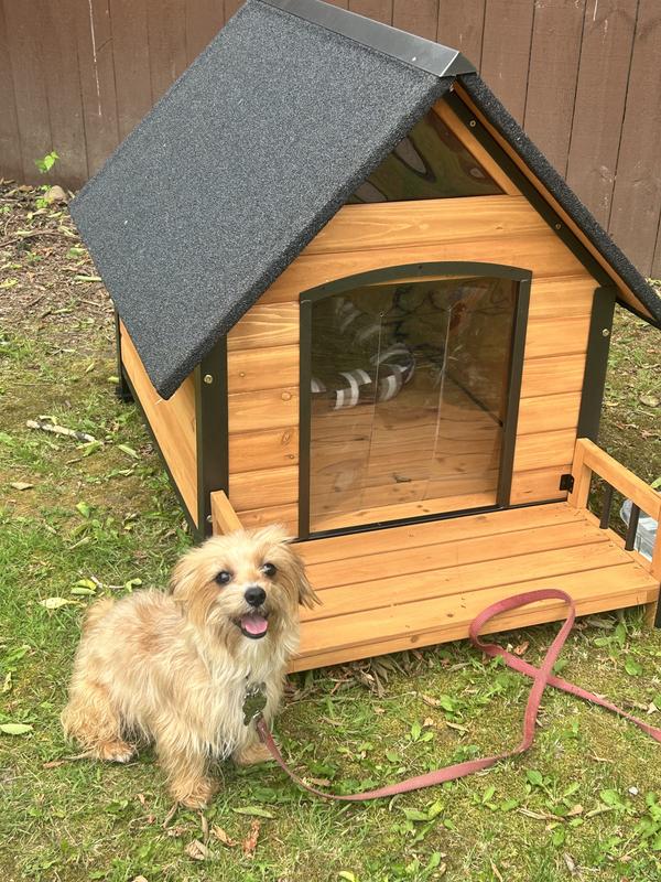 I like the doghouse. I bought the small size and it seems appropriate for my 14-lb terrier mix. Like other reviewers, I did discover some minor wood damage on receipt. And the attachment of the porch to the house is inadequate. I tend to be very particular about assembly instructions, so there were some clarifications I would have made to them. But you can use your common sense too. I'm not sure whether I will leave the clear vinyl 'door' in place since my dog seems a bit baffled by it, but dogs who are used to doggy doors would probably be okay with it.