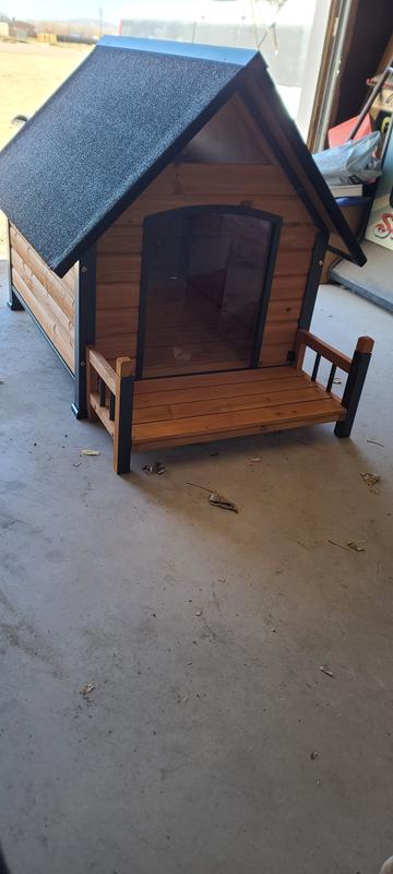 - Used inside or out, it features a big front door with transparent slats, so the inside of your fur-iend’s house stays warm if it’s outside, while the plexiglass windows provide light inside her dog house.