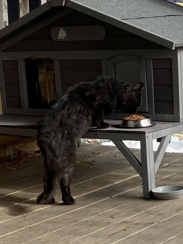 - The weatherproof asphalt roof offers excellent protection against rain, snow, and harsh weather conditions, while the transparent PVC door flap helps keep the elements out while allowing your cat easy access. It also includes a small porch so your cat can relax and enjoy the outdoors.
