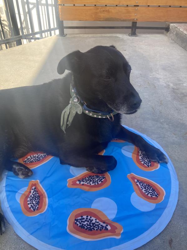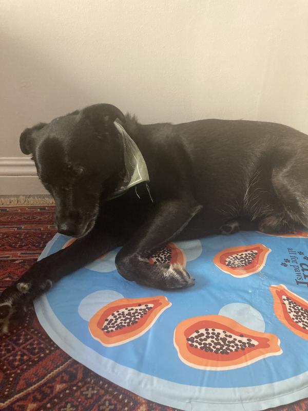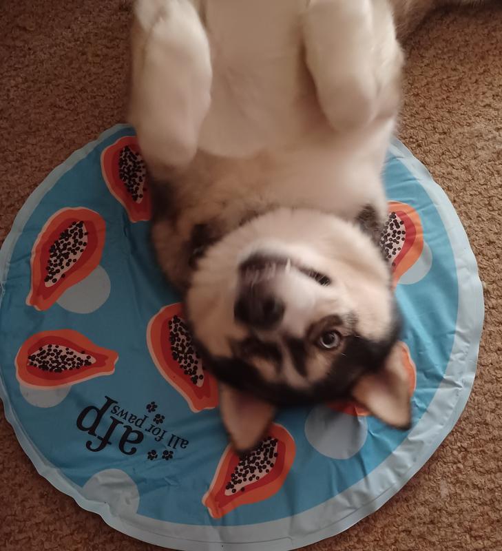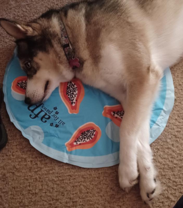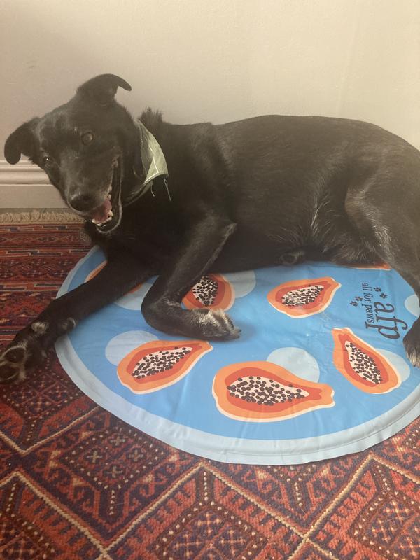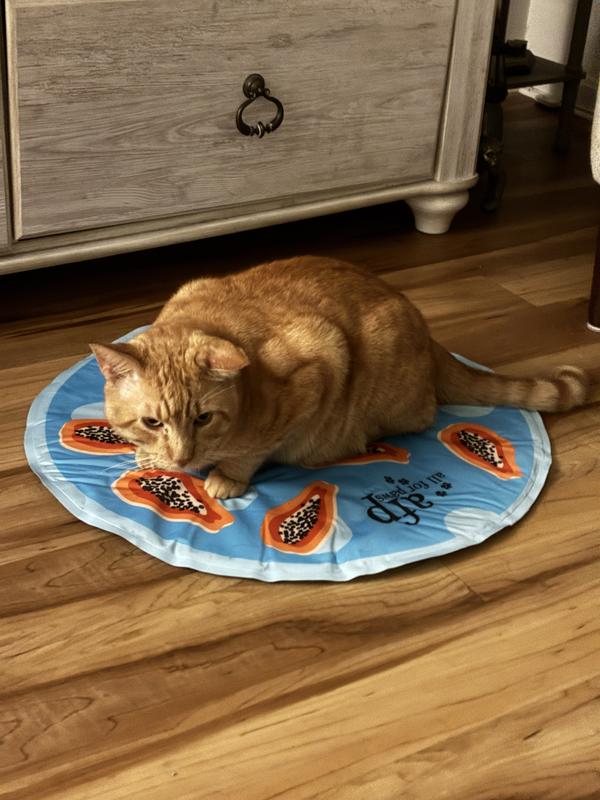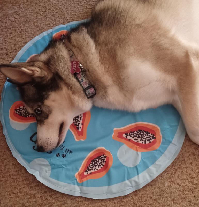 The papaya cooling mat is cool to the touch. It’s a perfect size for my Pug who weights about 25 lbs. The circular shape is good for dogs who like to curl up. It can be placed on the floor or on top of a bed for extra comfort. Unfortunately my Pug and two cats aren’t taking to it. It maybe due to the fact that I keep my air conditioner on 70 degrees. I’m only giving 3 stars due to them not using it.