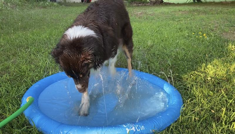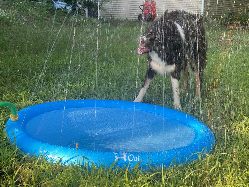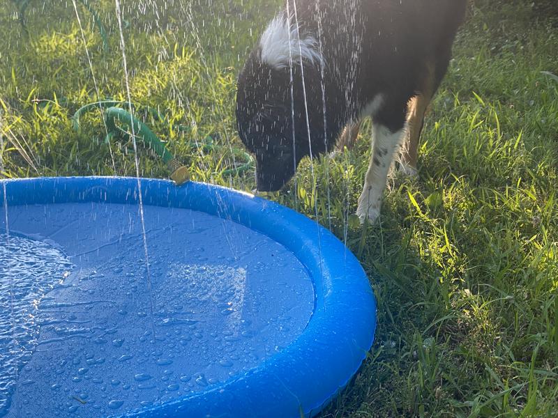 My Aussie looooves water, especially the hose, so at first she was confused about why I wasn’t just spraying her down. But I think she enjoyed trying to bite at the small little sprinklers along the edges, and she really loved digging at the pool in the center. Seems to be holding up well to her digging so far! It was a little confusing to set up, the instructions weren’t super clear (extra piece you don’t need when using a garden hose). But once I got it it worked really well and I’m looking forward to using it with her more this summer 😎