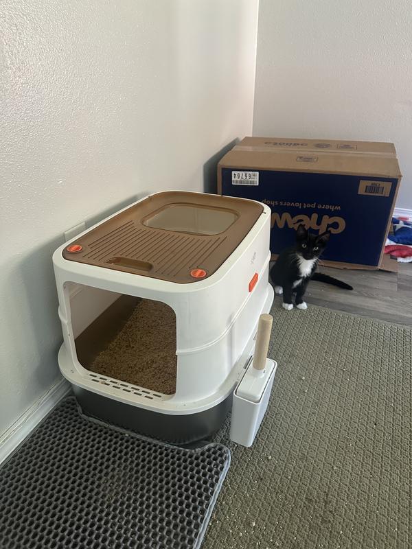 My two cats love this litter box. I do, too! The litter doesn’t stick to the stainless steel pan, and it doesn’t smell much at all (probably thanks to the litter more than the box, though). I popped the door flap off because I knew they’d be weary of using this box with it on; it’s easy to take the door flap on/off. They love entering through the front and exiting through the top. Scooping it is easy, too, since the top locks into place and can be flipped up for cleaning! I also love that it came with a small litter mat and a scoop that stores on the side! Love it!