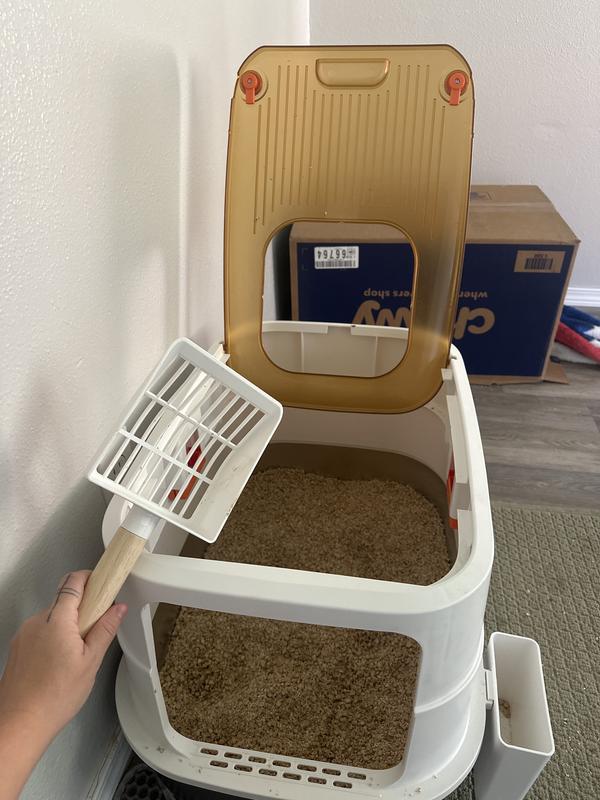 - Hooded enclosure reduces litter tracking and contains odors for a cleaner home.