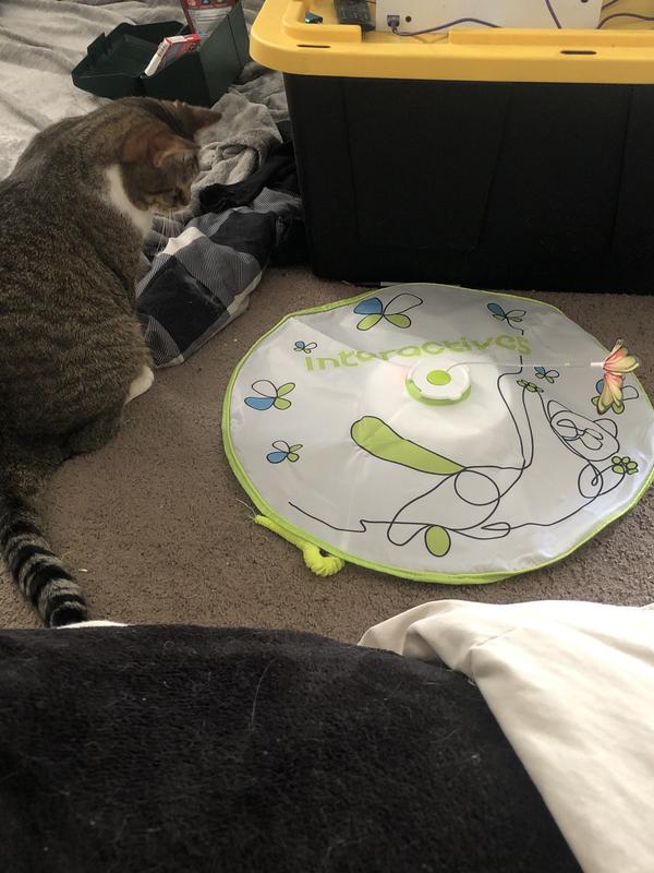 My cats can’t get enough of this! The toy that spins around seems kinda cheap as pieces of it are coming off and it was hanging by a thread after about an hour of use lol . I used some super glue and glued it and filed it back on and I havnt had a problem yet. The butterfly doesn’t spin too fast but my cats love it, he started playing with it as I was putting it together! It is abit noisey but I can tune it out. A fan will help lol. The battery life is also surprising very long! I havnt tested it fully yet but I’d say a full charge would last 3 hours or so. I bought two and I don’t regret it:)