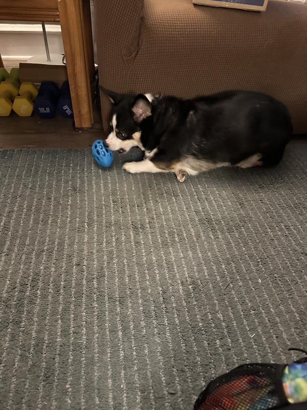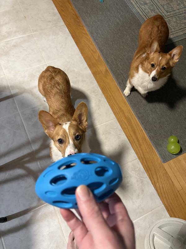 This one is a winner! My dog celebrated when she got this toy! It makes an irresistible chuckling noise. She tossed it around to hear the sound. We played fetch with it. She even spent a while testing the durability of the rubber by gnawing on it. I even put a biscuit in the holes to make it more tempting. A week later she’s still happy with it. It is a keeper.