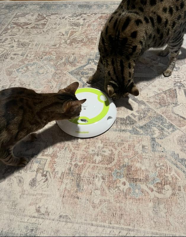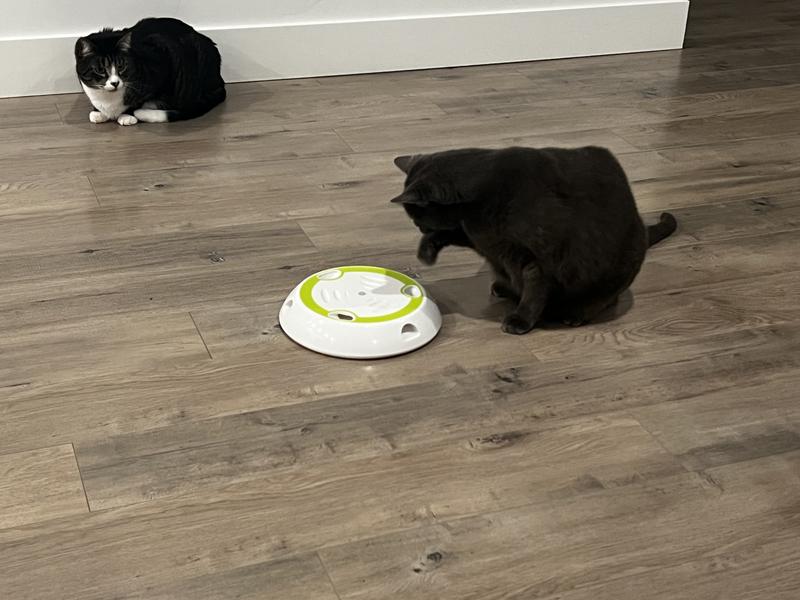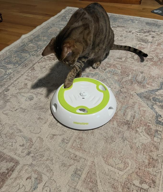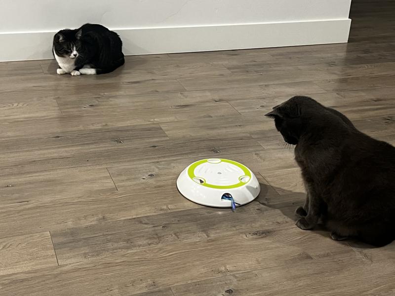 Product is very easy to set up (you just need a small screwdriver and four AA batteries). Once turned on, it took my cats a few minutes to trust it wasn't going to do anything to them. My 10 yr old cat took to it and started following it with his head for a bit, then actively playing. He enjoyed batting the little blue piece as it comes out of the various holes. I let him play with it for 15 mins, they put it away. Each day I pulled it back out, he went right back to enjoying it for the time I left it out. The toy runs for two minutes and then turns off. It doesn't take much movement to start the toy on the two minute timer again. My younger cat is a bit more skeptical of the device. He will sit and watch his brother play with it, but he isn't sure he wants to jump in just yet. For that reason, I gave it four stars as it is not a hit with all cats. Over time, maybe he'll enjoy it (and then I'll update my review).