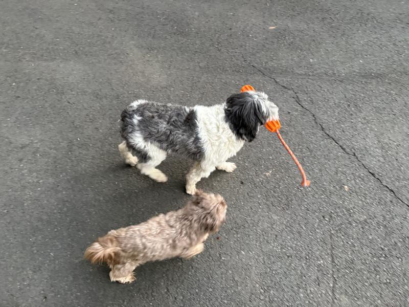 My dog loves chasing this he grabs on the rope or the rubber- easy to carry by the rope