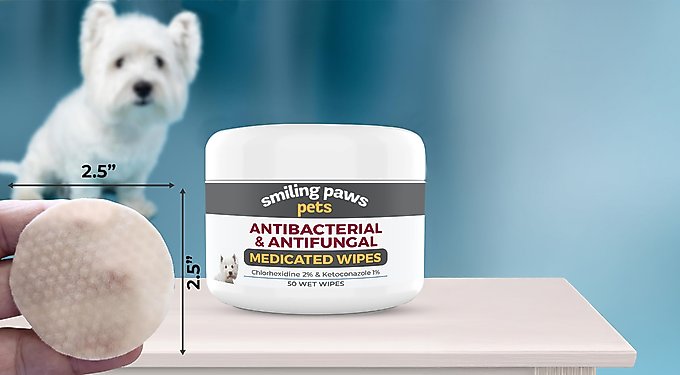 Smiling Paws Pets medicated wipes with antifungal ketoconazole and antiseptic chlorhexidine help treat common skin conditions in cats and dogs. The dual-action approach helps with issues like ringworm, yeast, hot spots, dermatitis, and more.