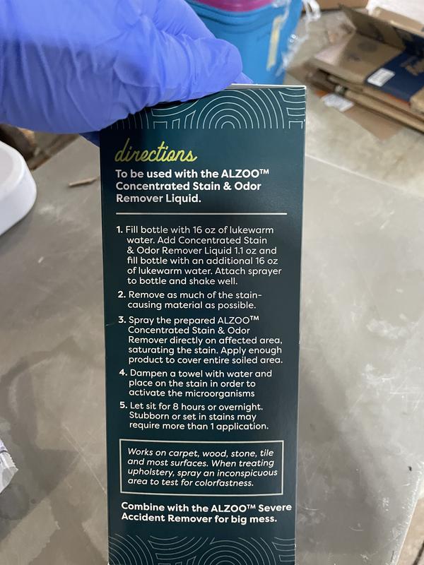 - Fill bottle with 16 oz of lukewarm water. Add Concentrated Stain & Odor Remover Liquid and fill bottle with an additional 16 oz of lukewarm water. Attach sprayer to bottle and shake well.