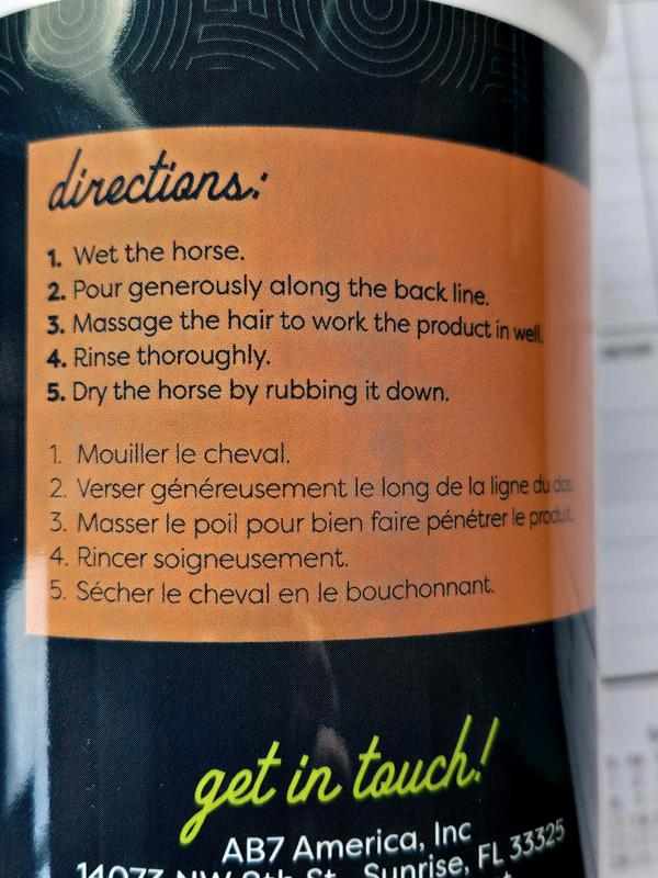 Thoroughly wet your horse’s coat. Pour a generous amount of the product along the spine and gently massage it into the hair, working up a rich lather. Rinse thoroughly to remove all residue, then dry your horse as usual.