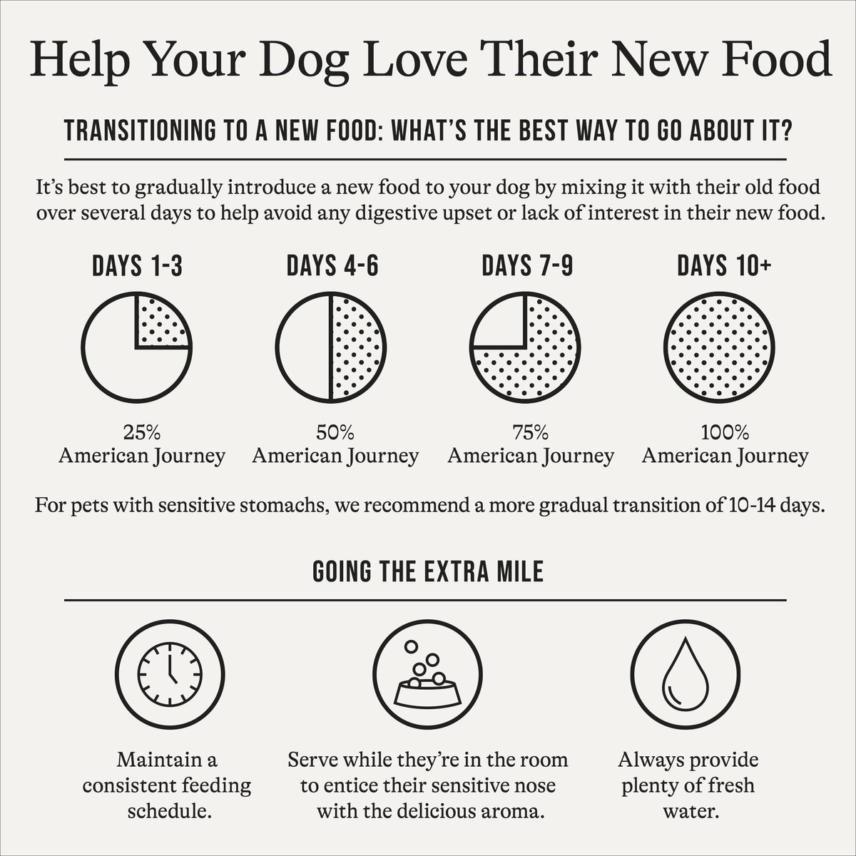 If you plan on transitioning to a new American Journey kibble flavor, we recommend mixing the food gradually for 7-10 days until the transition is complete. For sensitive dogs, we recommend a 10-14-day transition.