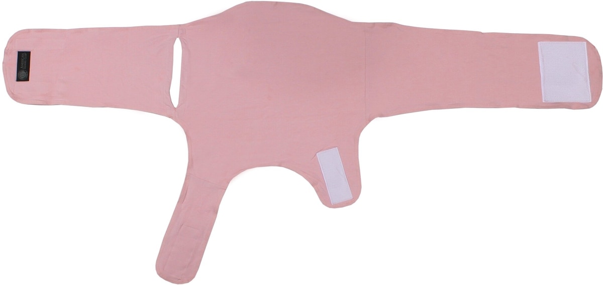 Place the Calming Coat on your dog's back. Fit the Long Chest Wrap around the front of your dog and secure to velcro on Short Chest Wrap. Be sure not to secure too tightly, to prevent limiting your dog's movement. Then wrap the Long Body Wrap under the torso of your dog through the Body Slit. Continue the Long Body Wrap around the back of your dog. Wrap Short Body Wrap under the torso of your dog and secure to velcro straps on opposite side of Long Body Wrap. Adjust as needed for proper snug fit.