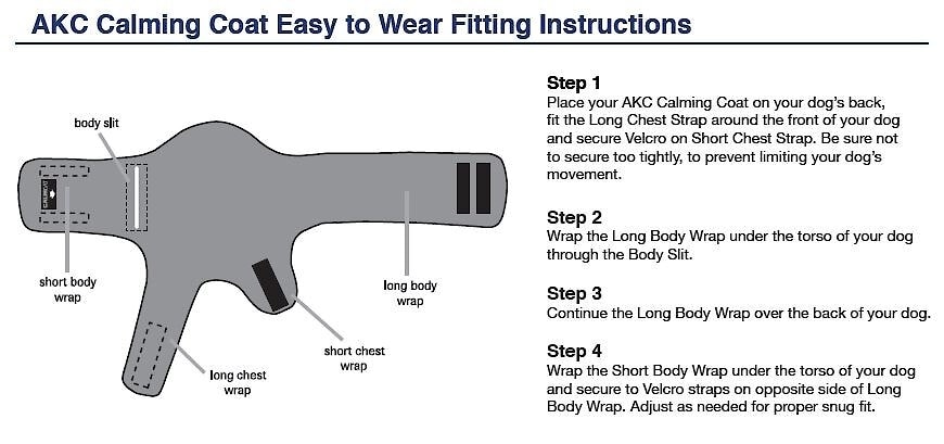 Place the Calming Coat on your dog's back. Fit the Long Chest Wrap around the front of your dog and secure to velcro on Short Chest Wrap. Be sure not to secure too tightly, to prevent limiting your dog's movement. Then wrap the Long Body Wrap under the torso of your dog through the Body Slit. Continue the Long Body Wrap around the back of your dog. Wrap Short Body Wrap under the torso of your dog and secure to velcro straps on opposite side of Long Body Wrap. Adjust as needed for proper snug fit.
