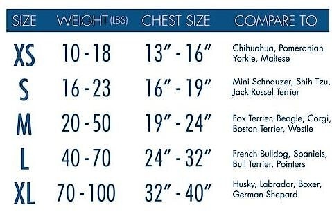 The sizing chart may be located by clicking the “Size” tab, on the product page. While weight is listed, the pets chest girth measurement is most accurate to use for size. To measure the chest girth you'll measure around the broadest part of the rib-cage behind the front legs. If the dog happens to be in between sizes, it's then recommended to select the bigger size.