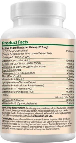 The Ocu-GLO formula is founded on the three core antioxidants for vision: grape seed extract, lutein, and omega-3 fatty acids. These key ingredients are combined with other carefully chosen antioxidants to support canine and feline eye health.