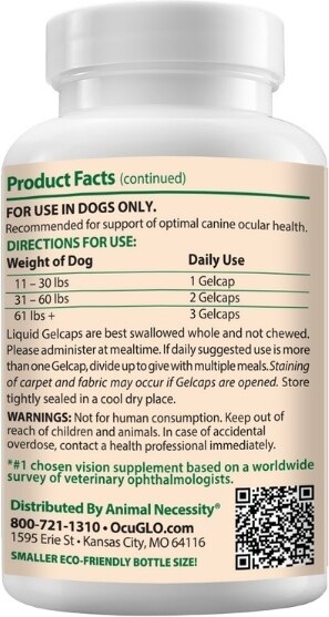 - Animal Necessity Ocu-GLO Softgel Vision Supplement for Small Dogs, 90 count$78.00 Chewy Price$74.10 Autoship PricePromo, New Customers Only: Spend $49+, Get $20 eGift Card +1 deal