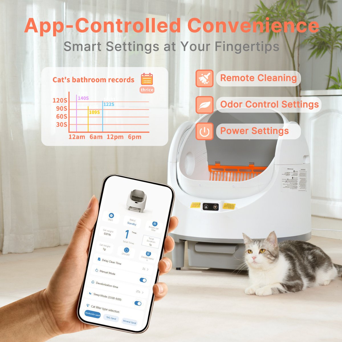 Say goodbye to unpleasant litter box smells! Advanced odor-fighting technology and a built-in deodorization system neutralize odors. The sealed waste management design locks in smells, ensuring a pleasant living space for both you and your cats.
