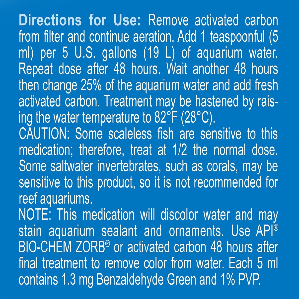 You must add 1 teaspoon (5 milliliters) for every 5 gallons of aquarium water. The 1.25 ounce treats 10 U.S. gallons of fresh or salt water and the 4 ounce bottle treats 118 U.S. gallons of fresh or salt water