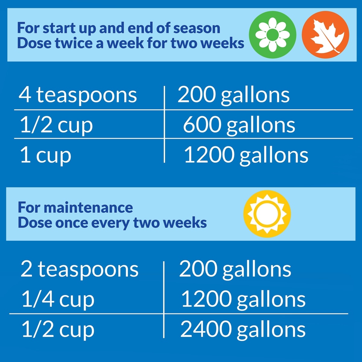 We would recommend to add 4 teaspoons per 200 U.S. gallons of API Pond Zyme twice a week for two weeks for spring start up and end of season application.