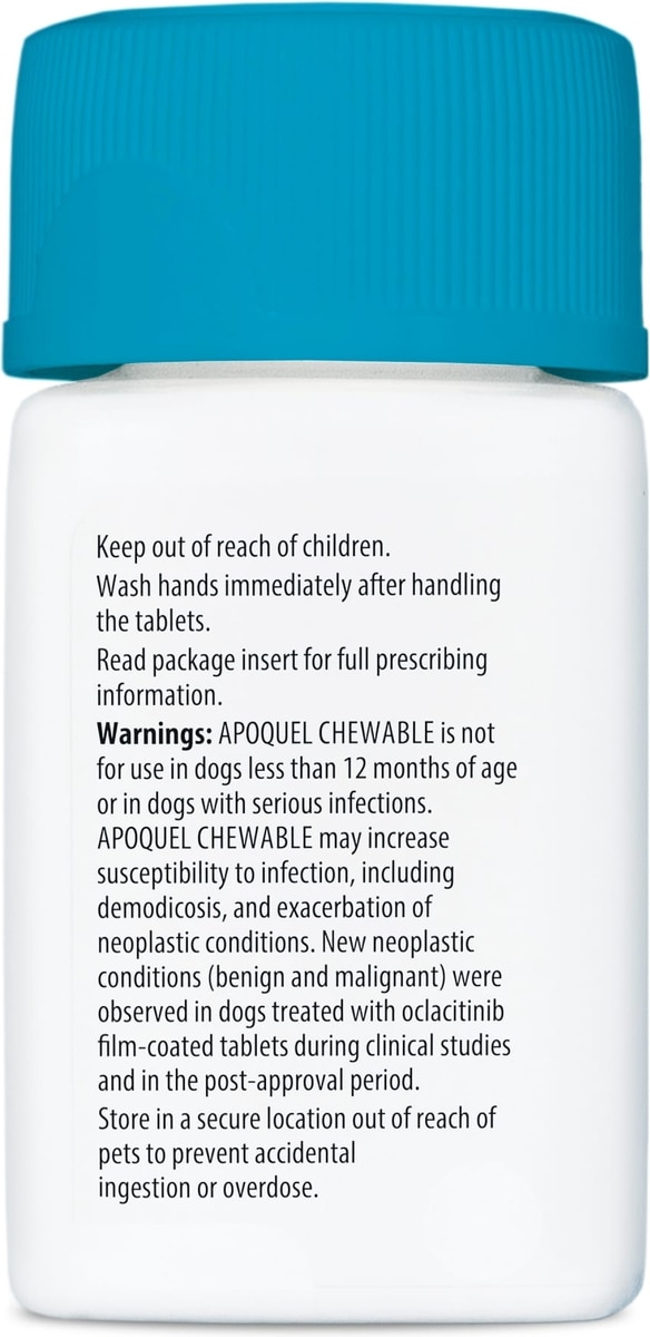 See full Prescribing Information. Do not use Apoquel Chewable in dogs less than 12 months of age or those with serious infections. Apoquel Chewable may increase the chances of developing serious infections, and may cause existing parasitic skin infestations or pre-existing cancers to get worse. Consider the risks and benefits of treatment in dogs with a history of recurrence of these conditions. New neoplastic conditions (benign and malignant) were observed in clinical studies and post-approval. Apoquel Chewable has not been tested in dogs receiving some medications including some commonly used to treat skin conditions such as corticosteroids and cyclosporines. Do not use in breeding, pregnant, or lactating dogs. Most common side effects are vomiting and diarrhea. Apoquel Chewable has been used safely with many common medications including parasiticides, antibiotics and vaccines.
