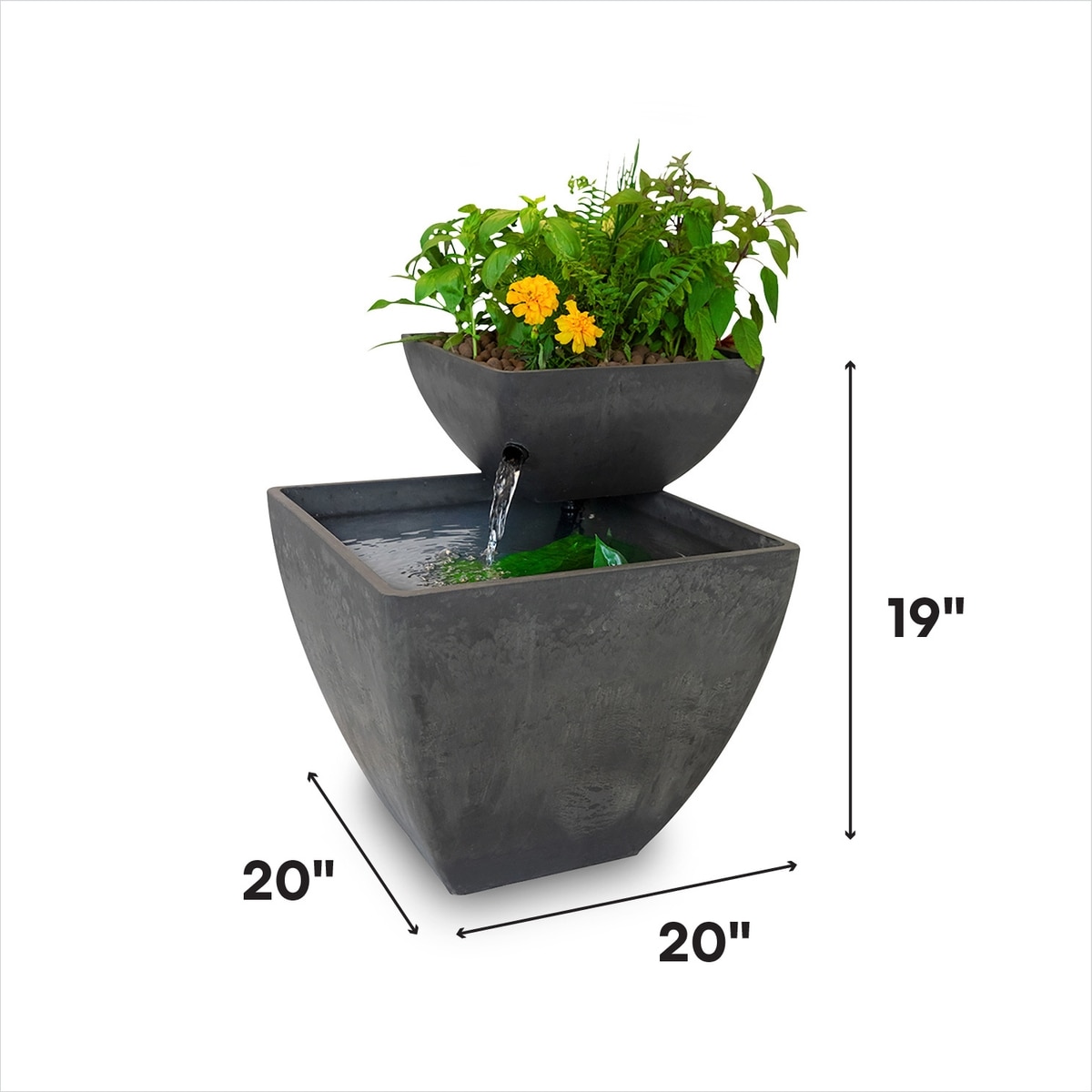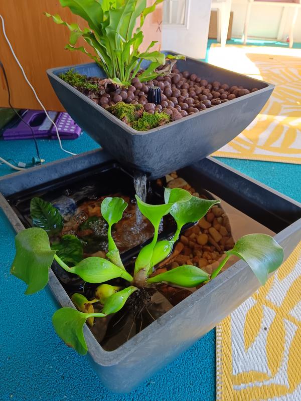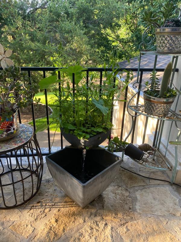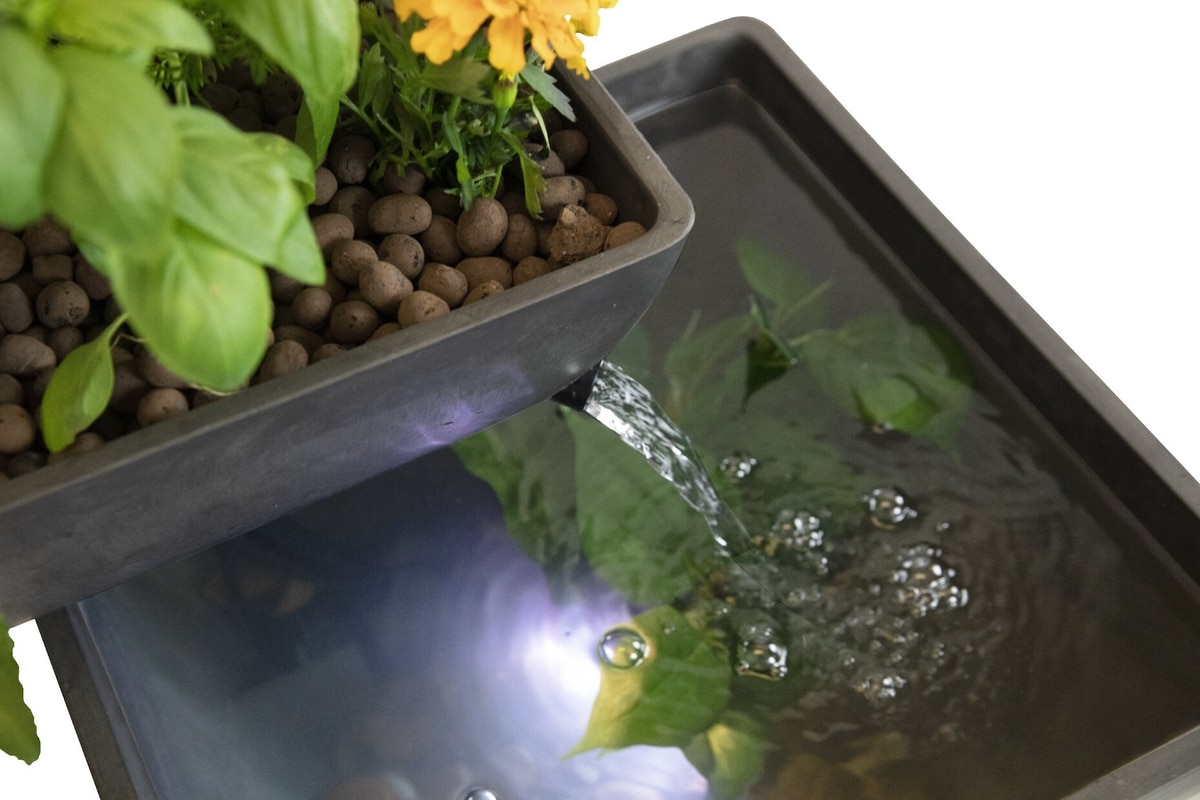 This ecosystem kit is a durable, weatherproof and stone-like grow bed and fountain reservoir. It is suitable to grow houseplants and low-maintenance ornamentals anywhere; place in the sun or add a grow light and grow herbs, greens, and many small-statured fruits and vegetables. It has room for 6 plants or more. It is also suitable for small aquarium fish species including tetras, mollies & platies, barbs, and more