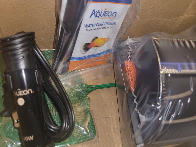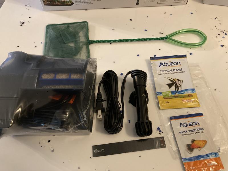 This kit includes a quiet flow LED pro power filter, Medium Filter Cartridge, Preset Heater 50W, Fish Net, Thermometer, Food and Water Care Samples. This kit can be paired with your aquarium of choice.