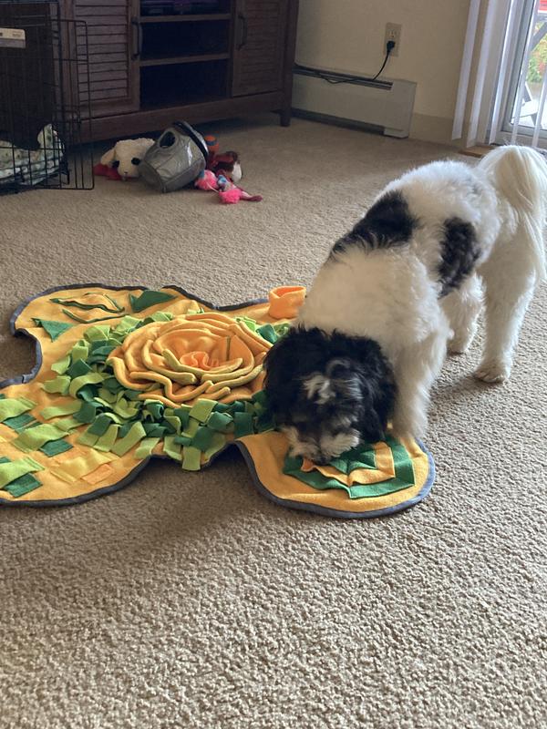I have a dog that is a super sniffer and thought this would make him happy. I need to 100% monitor as he is more interested in tearing the mat apart instead to take time to find the treat/treats. I have done my best to instruct him and guide on what to do but just not sinking in and before it ruins our relationship, I have put it aside. It was the more expensive one I purchased. Thinking of trying the round one with deep loops. Maybe all the different types of treat hiding places on this one is just to much for my pup.